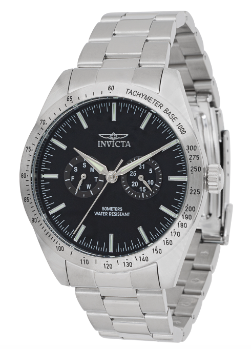 This incredible Invicta watch from the Specialty collection offers an exact Quartz movement, with an incredible steel case. The face displays a black, metal dial protected by our proprietary Flame Fusion Crystal. The design is completed by a steel, band. This timepiece can resist water for up to 50 m.