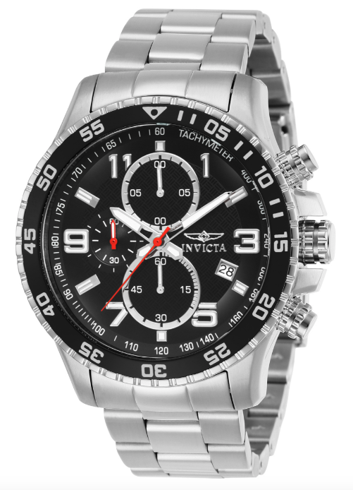 This impressive Invicta Specialty watch features a precise Quartz movement as well as a steel case. Its black, metal dial is enclosed by a highly protective Mineral Crystal. This watch is finished by a strong steel, stainless steel band, and it offers 50 m water resistance.