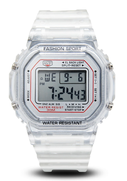 Crafted with the finest attention to detail, this shock-resistant digital sport watch embodies durability and modern design. Its sleek Transparent finish isn't just a fashion statement; it's a mark of reliability that complements your lifestyle, whether you're in the office or exploring the outdoors.
