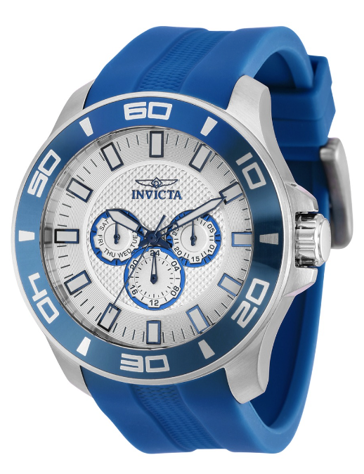 This Invicta watch from the Pro Diver collection holds a Quartz movement, and it features a sturdy steel case. On its face you can find a silver metal dial covered by a durable Flame Fusion Crystal. This style is finished by a reliable blue silicone band, and it offers 100m water resistance.