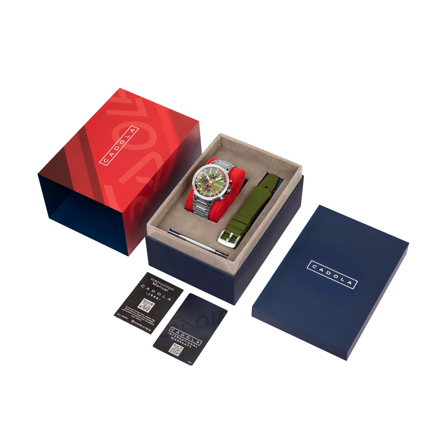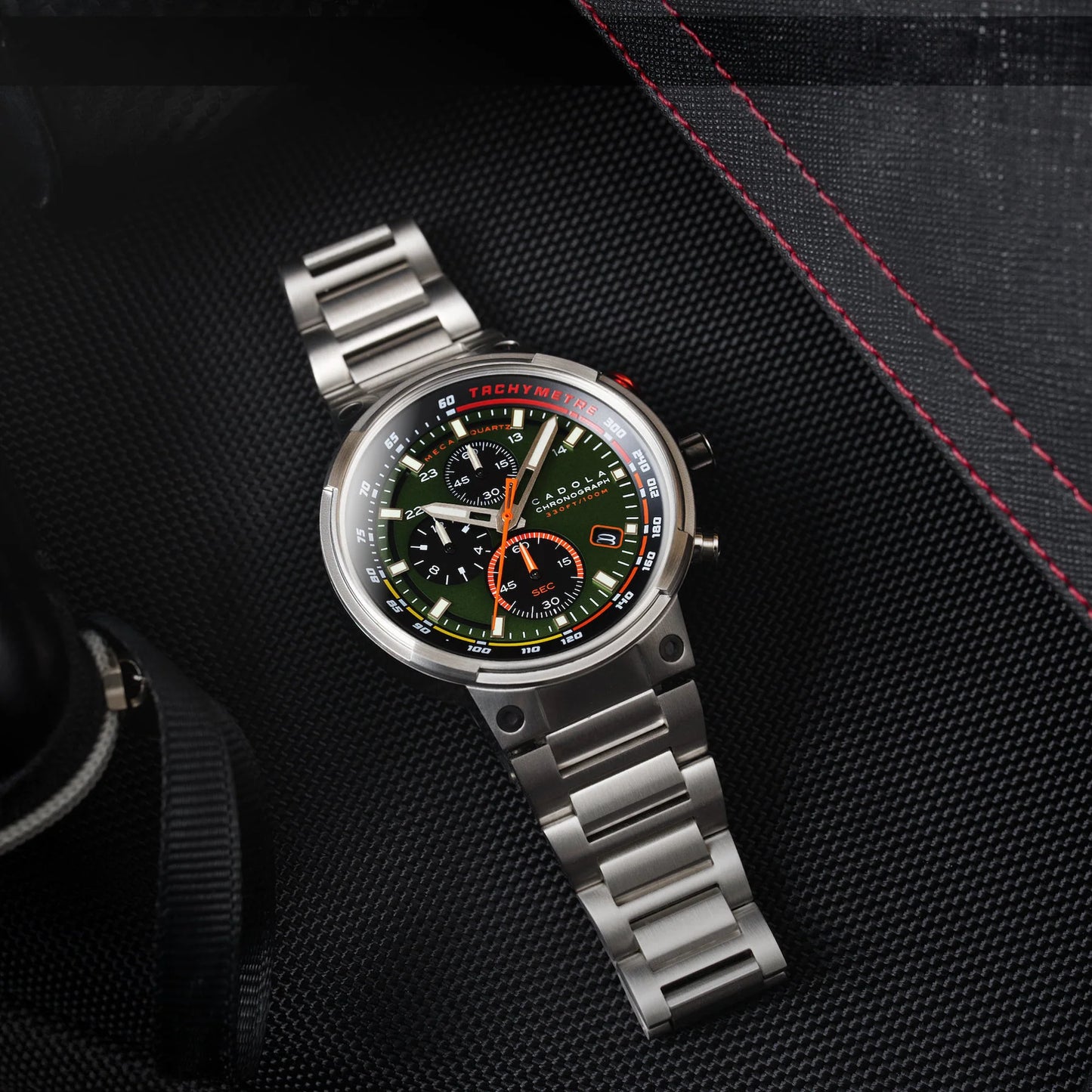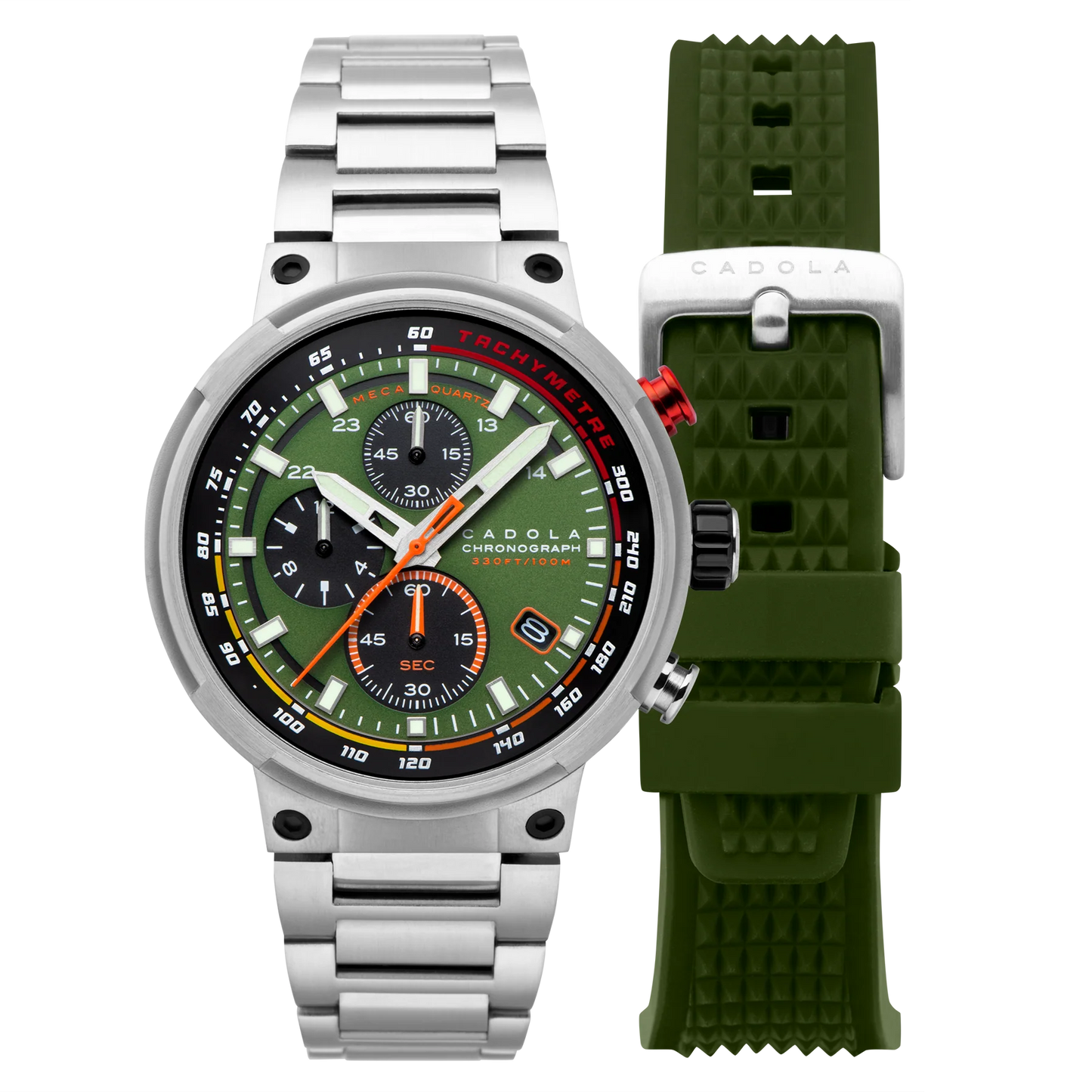 This racing-inspired timepiece is designed for speed, featuring an aerodynamic case that combines robust engineering with a sleek profile. Powered by the impressive hybrid VK series TMI Japan Meca-quartz chronograph movement, it delivers exceptional performance. The watch includes an additional custom molded polyurethane strap for added versatility, alongside its solid stainless steel bracelet.