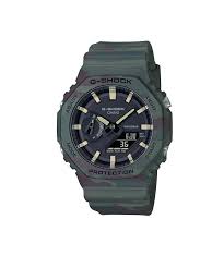 From the toughness-driven G-SHOCK, a design inspired by adventurers whose love of the wilderness knows no bounds. Switch between interchangeable bands and bezels for a thin octagonal GAE2100 with an even wilder spirit. Green nature-inspired camouflage and vibrant outdoor-fashion orange take you from fashionable urban streets to wilderness exploration in cool, casual style.