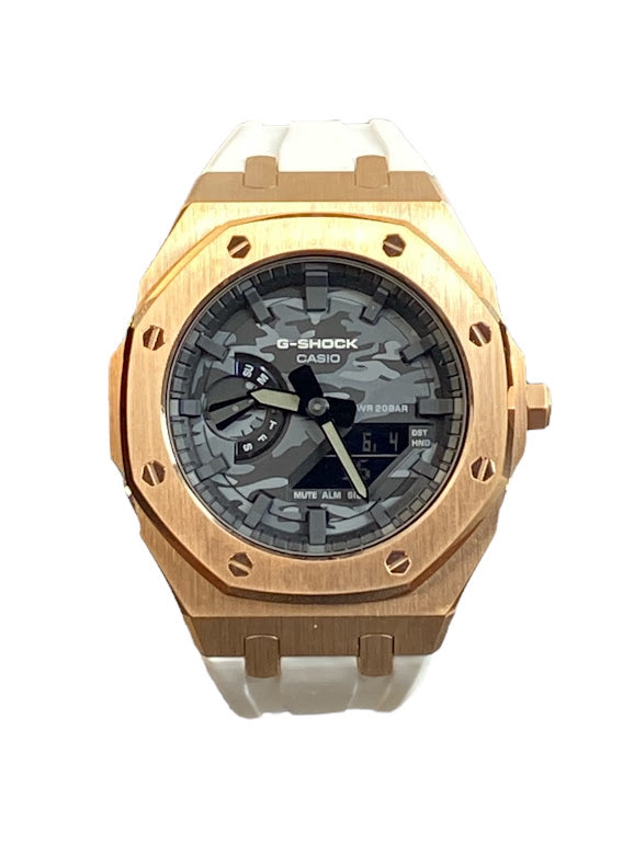 GShock Mod AP Style Rose Gold w/White Band/ Black and Grey Camo Stainless