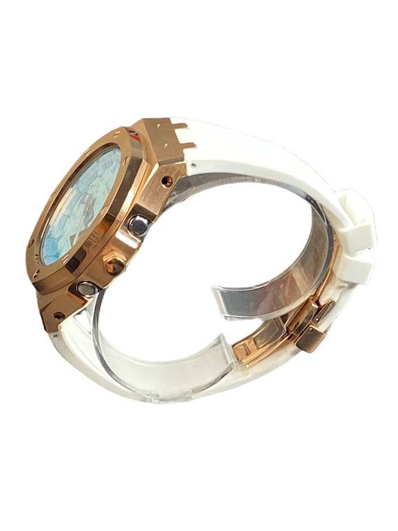 GShock Mod AP Style Rose Gold w/ White Band/ Blue Stainless