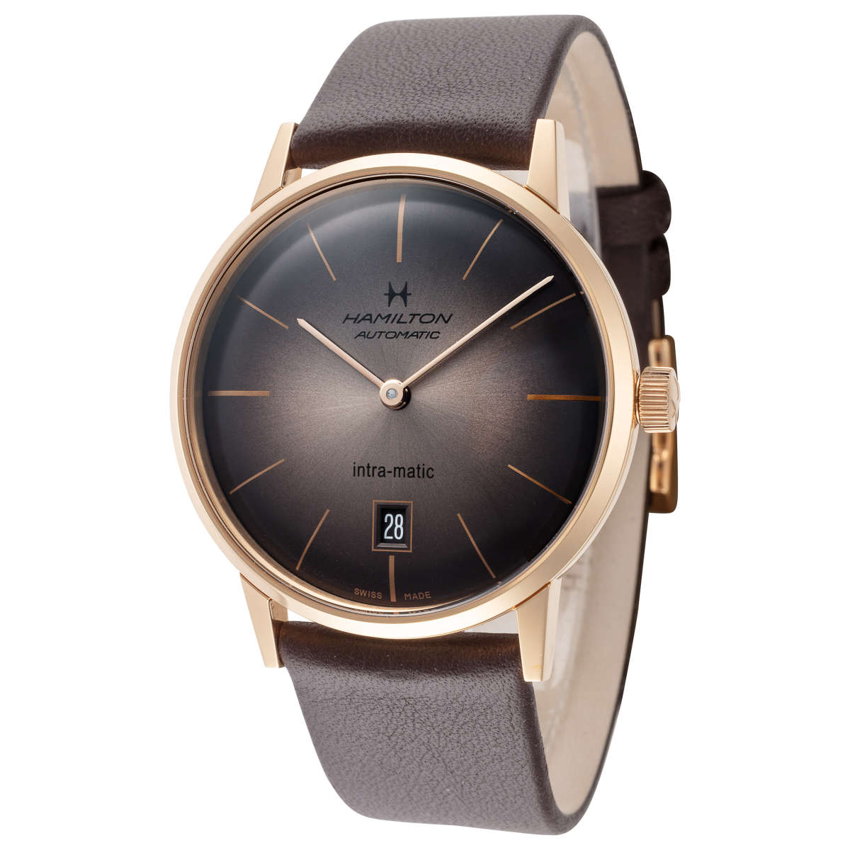 Reawaken your vintage spirit with the Hamilton IntraMatic men’s watch. A unique smoky brown dial houses rose gold tone hands and stick hour markers. A date display at the 6 o’clock position offers increased functionality. Coated in rose gold tone PVD, the 38mm stainless steel case houses an ETA Calibre 2892-A2 automatic movement with a 42 hour power reserve.