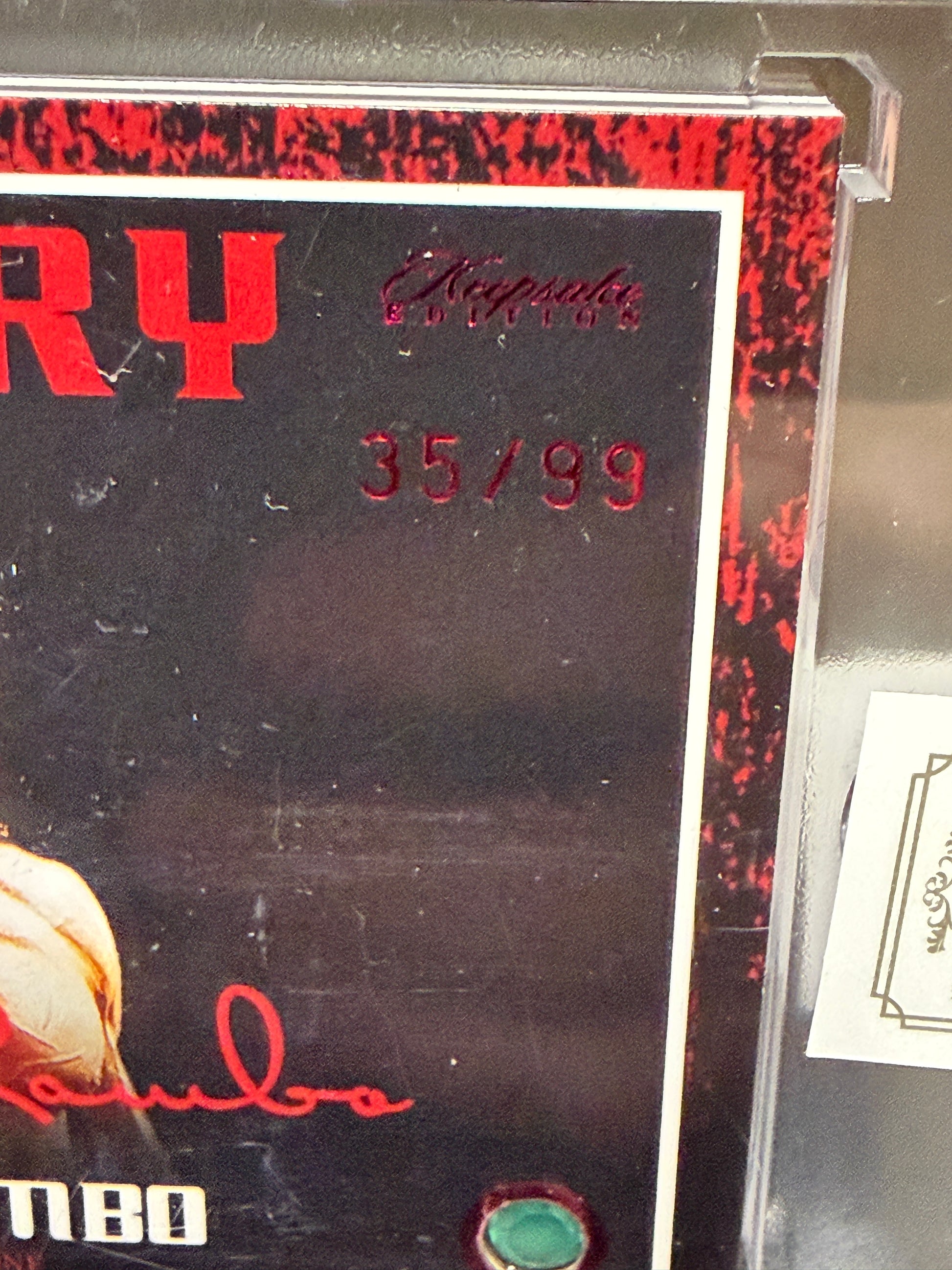 Individually numbered 35 out of only 99 produced worldwide, this limited-edition card blends classic action-movie nostalgia with refined presentation. The deep green onyx gemstone adds a premium, elegant touch, setting this card apart from traditional relic or autograph cards.
