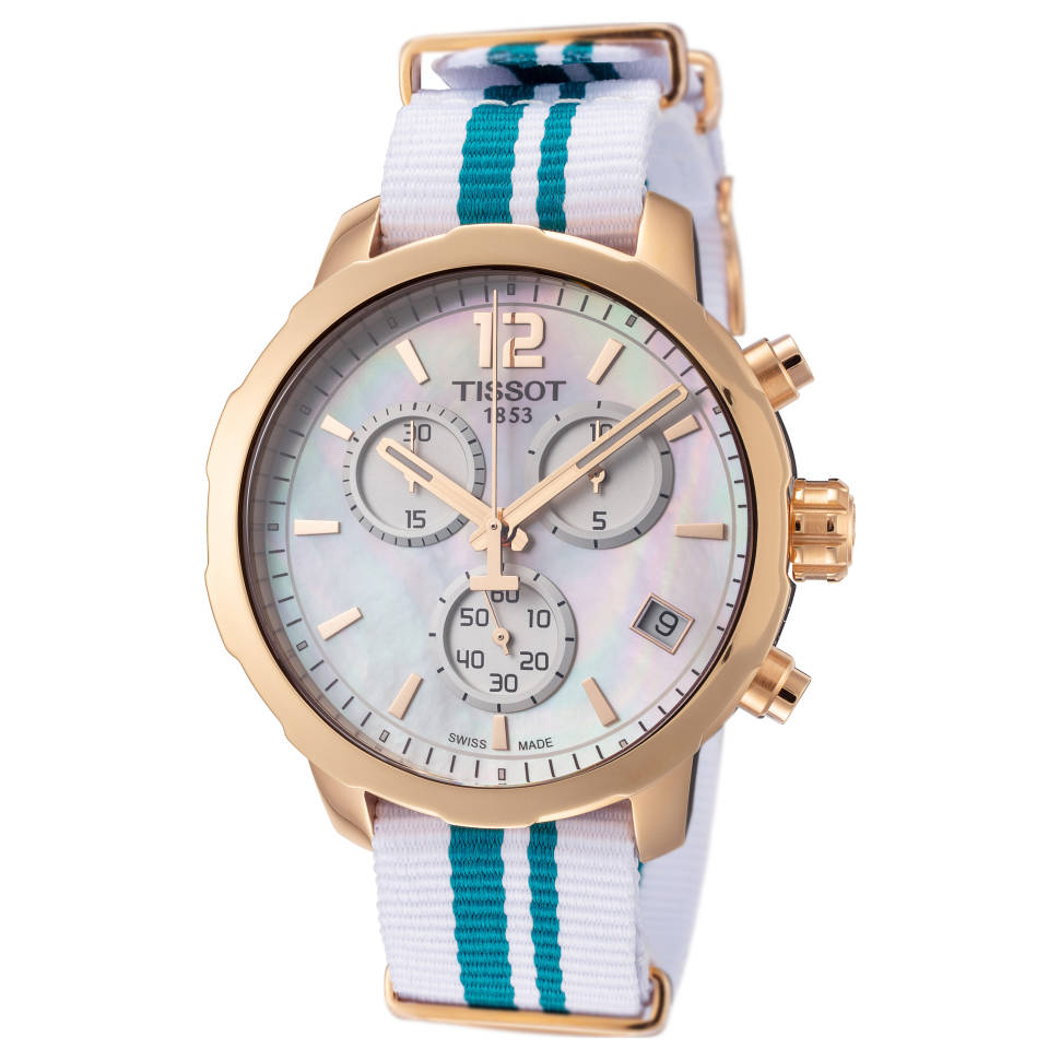 Introducing the Tissot T-Sport, a unisex watch hailing straight from Switzerland. This watch boasts a Swiss-made quartz movement, encased in rose gold PVD stainless steel, and safeguarded by a scratch-resistant sapphire crystal. The stunning 42mm round case features a closed back and offers water resistance up to 100 m. Adorned with a radiant mother-of-pearl dial, this timepiece showcases a handy date feature. It's elegantly tied together by a blue fabric strap, secured with a pin buckle. Embrace the perfect blend of elegance and functionality with the Tissot T-Sport. T0954173711701