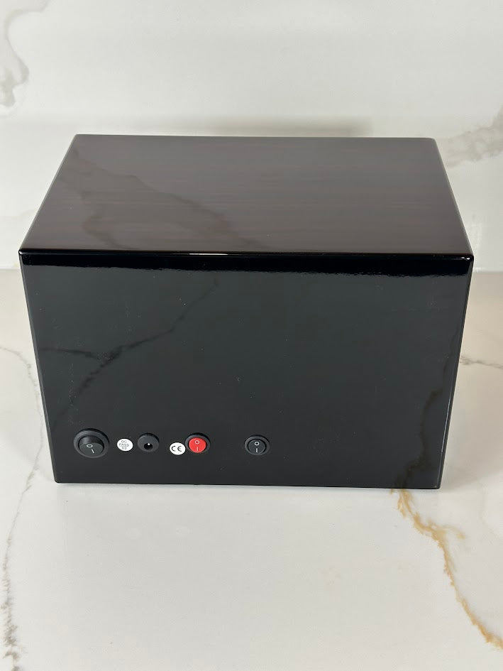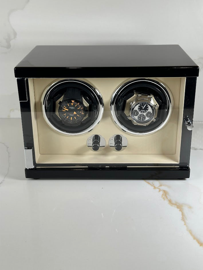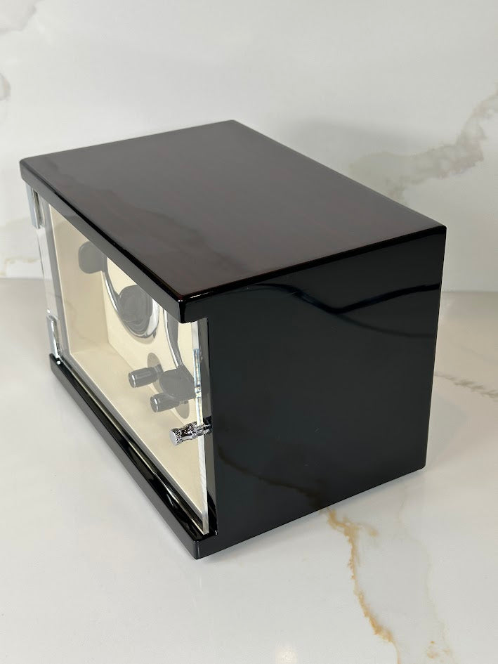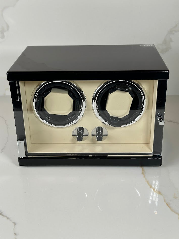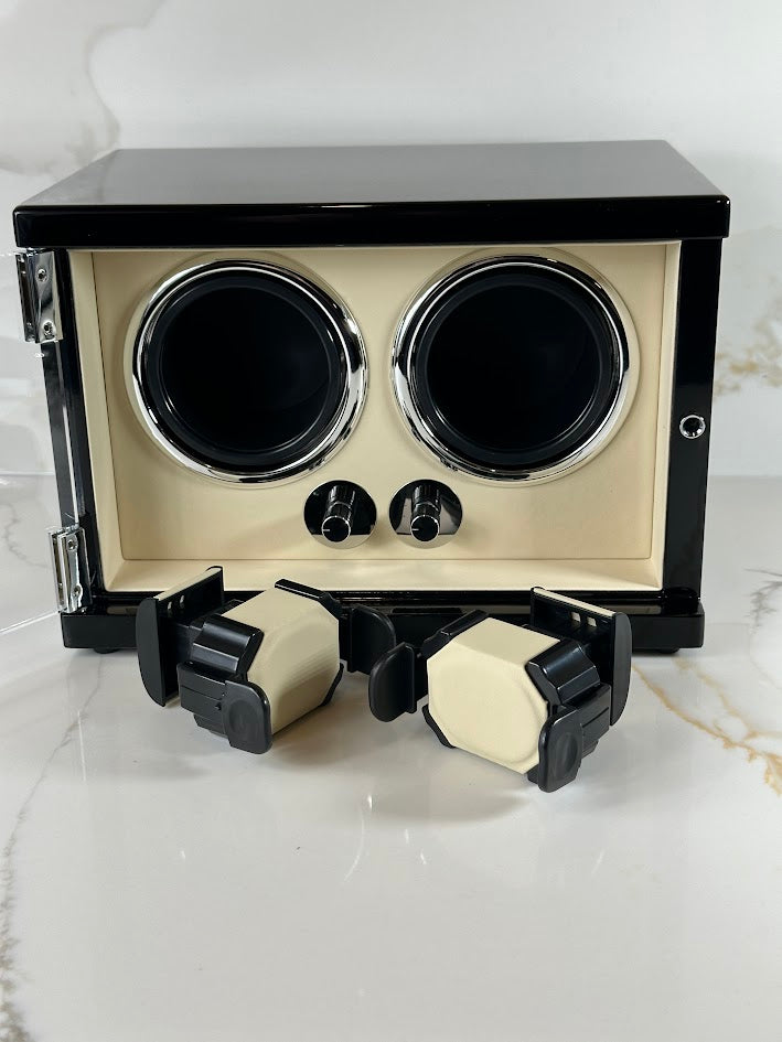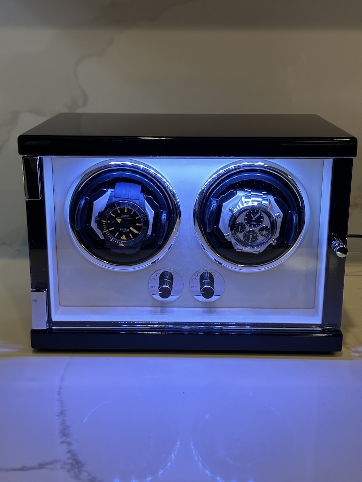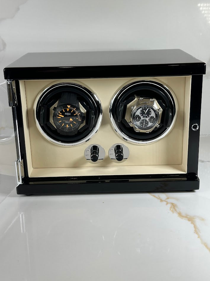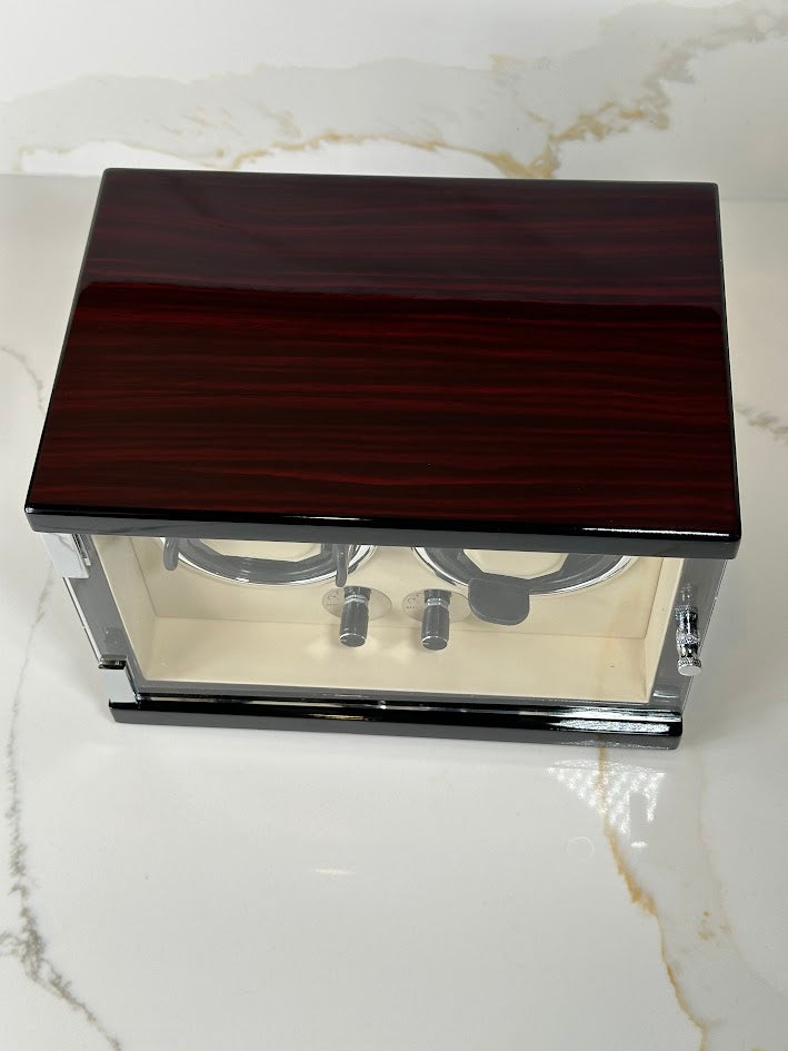 Beautiful 2 Slot, Gloss Black Box With Cherry Gloss Top, Automatic Watch Winder Display Case, Also Glows LED White. This Winder Has A Control Dial For Each Of The 2 Slots. Watches NOT included But Are For Sale! Very Sharp and Luxurious!